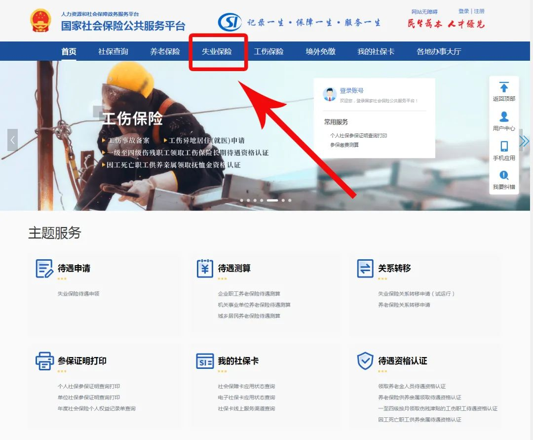 3、登錄“國(guó)家社會(huì)保險(xiǎn)公共服務(wù)平臺(tái)”(http://si.12333.gov.cn),點(diǎn)擊【失業(yè)保險(xiǎn)】→【失業(yè)保險(xiǎn)待遇申領(lǐng)】→【失業(yè)保險(xiǎn)金網(wǎng)上申領(lǐng)】辦理。